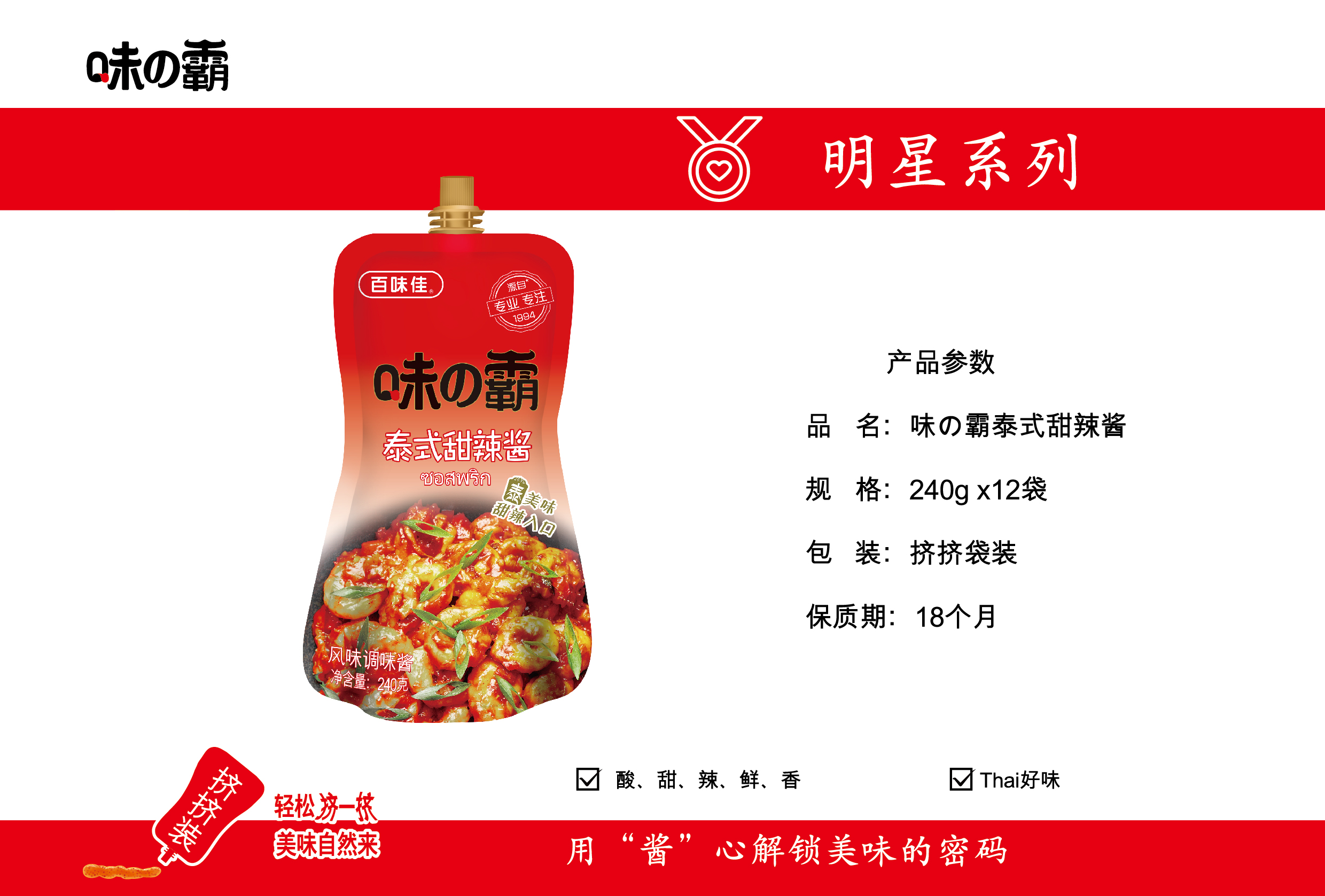 味の霸 泰式甜辣醬(擠擠裝) 相關產品: 味の霸 泰式甜辣醬(擠擠裝) 味の霸橙飲料濃漿810ml2016/07/08 冬陰功醬90g2016/07/08 牛雜醬效90g2016/07/08 味の霸番茄沙司(擠擠裝)2016/07/08 沙拉醬(擠擠裝)2016/07/08