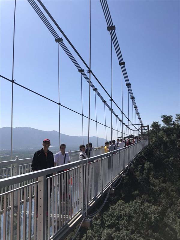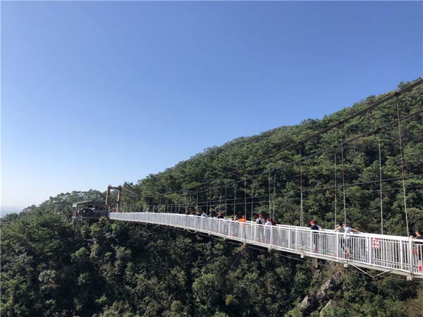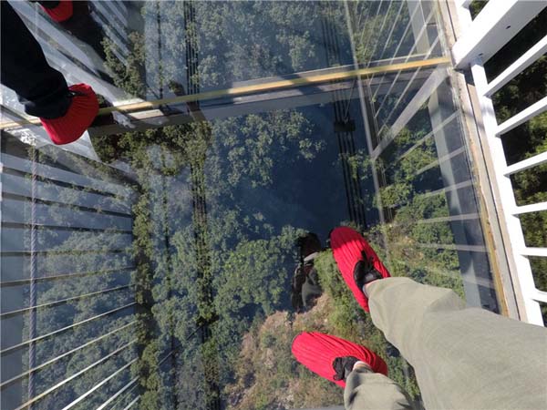 由鐵索和多塊巨大透明玻璃搭建而成,橋全長達250米!懸空的橋身200米!離地高度超200米!