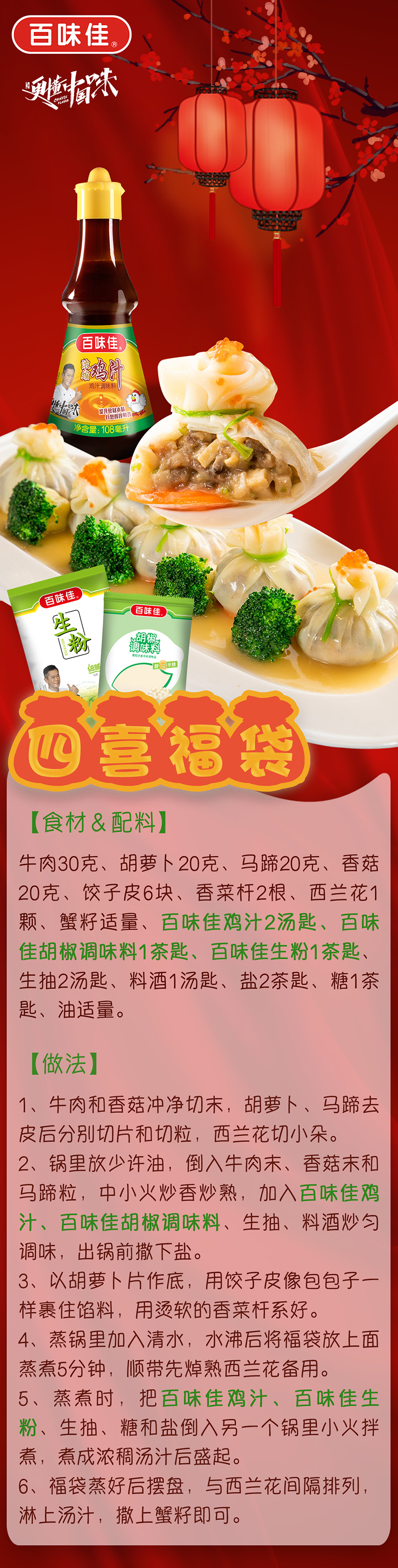 元宵節(jié)菜譜四喜福袋(應(yīng)用百味佳雞汁、生粉、胡椒調(diào)味料) 發(fā)布時(shí)間:2022-2-18 9:15:34 相關(guān)閱讀: 元宵節(jié)菜譜四喜福袋(應(yīng)用百味佳雞汁、生粉、胡椒調(diào)味料) 七夕味覺(jué)“食”刻,用百味佳醬料點(diǎn)燃浪漫餐桌!2025/09/03 秋日貼膘季|用酸甜橙香與醇厚醬香,解鎖初秋味覺(jué)新體驗(yàn)!2025/09/03 新品上市 百味佳焙煎芝麻口味沙拉汁,為輕食簡(jiǎn)餐添好味!2025/09/03 情暖八一 百味佳攜手共赴一場(chǎng)老兵之約,以公益之心傳承紅色軍魂2025/09/03 重磅官宣,佳哥表情包全新上線啦,快來(lái)一起聊天吧!2025/09/03